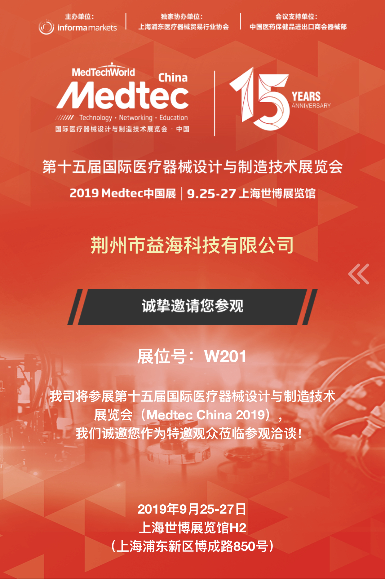 我司將參展第十五屆國際醫(yī)療器械設(shè)計(jì)與制造技術(shù)展覽會(huì)(Medtec China 2019),展位號(hào):W201.我們誠邀您作為特邀觀眾蒞臨參觀洽談!